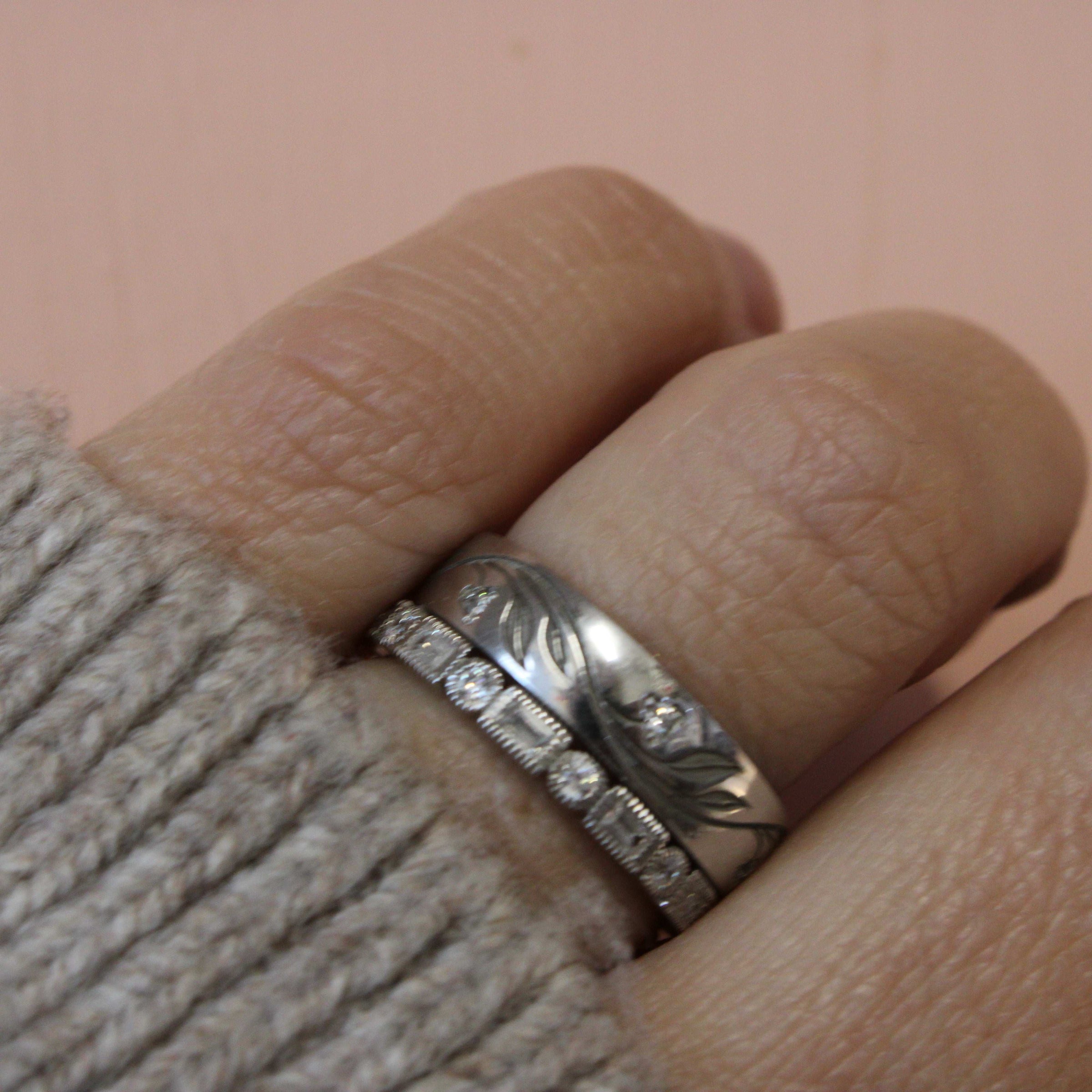 We love flowers and why not have them engraved on your forever wedding ring. This is embellished with 12 tiny 1mm natural diamonds set as clusters of 3s as blossom.