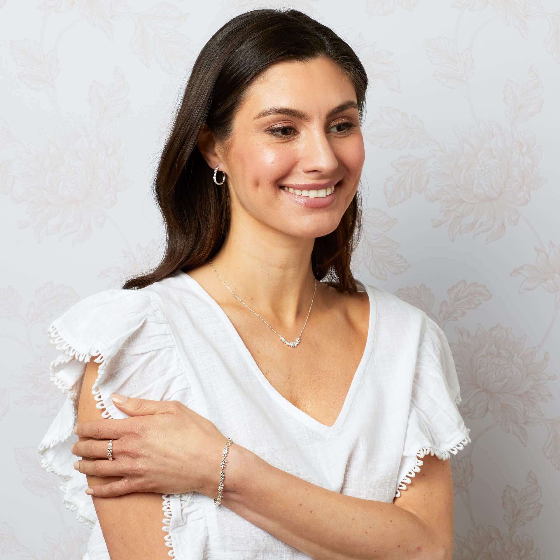 Beautifully crafted from recycled sterling silver, this graceful scoop necklace is inspired by Laura Ashley’s Naunton Folly print. A bespoke painted piece drawn from the rich heritage of the Laura Ashley archive; it combines elements from various prints to create an inviting British stately home garden scene. The gently curved design of the necklace is adorned with dainty blossoms that echo the romantic detailing of the print’s rose-covered arches and flourishing borders. Perfect for adding a feminine touch to any outfit, wear this necklace with the matching items to softly evoke the timeless elegance and charm of an idyllic English summer.