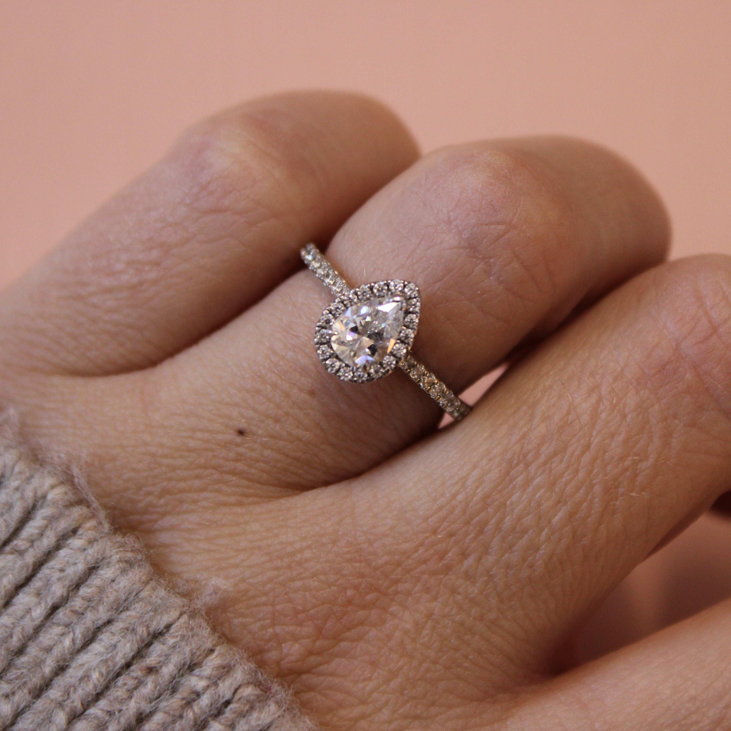 Our sample is set with a 0.50ct centre, pear cut diamond. It has a halo of diamonds with an additional diamond carat weight of 0.35cts.